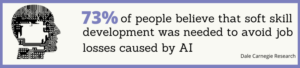 Dale Carnegie research showed that 73% of people believe that soft skill development was needed to avoid job losses caused by AI, with communication, creativity and critical thinking ranking as the most important. Furthermore, 63% of employees would expect their employer to offer them this training. This is therefore about shifting fears over the advent of AI and using it as training opportunity and a way to boost corporate culture. While technology and big data will be the driving force for digital transformation, company leaders must look beyond the technology and develop a culture of learning to ensure the right skills are in place to enable employees to adapt to change and support the successful implementation of AI.