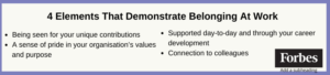 In simple terms, inclusion relates to behaviour in the workplace, and belonging pertains to the feeling and emotions around being part of an organisation. In a recent article in Forbes entitled How any businesses can create a culture of belonging in the workplace it discusses four elements that demonstrate belonging at work: