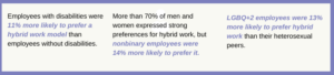 How do you build an inclusive environment and lead effectively when many of your staff are not physically present together? A hybrid working model arguably works for those juggling family commitments but there is of course the negative side of those employees forced into remote working and leaders having to support feelings of isolation and fragmentation that have a mental health implication. In an article entitled ‘Hybrid work making it fit with your diversity, equity and inclusion strategy’, McKinsey shows data on underrepresented groups that showed a strong preference for hybrid work: