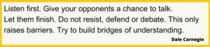 - Set the tone. Think about the language you are using – ‘ I need you to’, ‘I’m here to tell you’, ‘With all due respect’, ‘What I want’, can be perceived by some people as challenging. Alternative phrases could be, ‘Let’s go over’, ‘Let’s look at how we can’, ‘Possibly you could’, ‘Understanding different views…’.